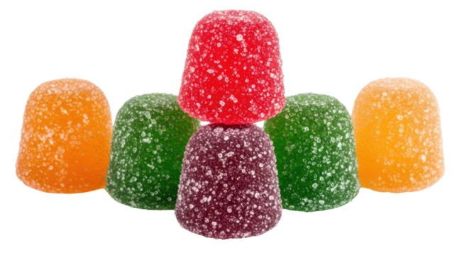 Colorful, sugar-dusted gumdrops piled together, showcasing red, yellow, green, pink, and cream confectionery treats. background removed