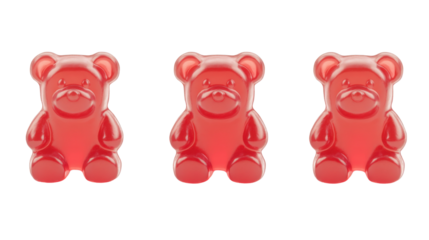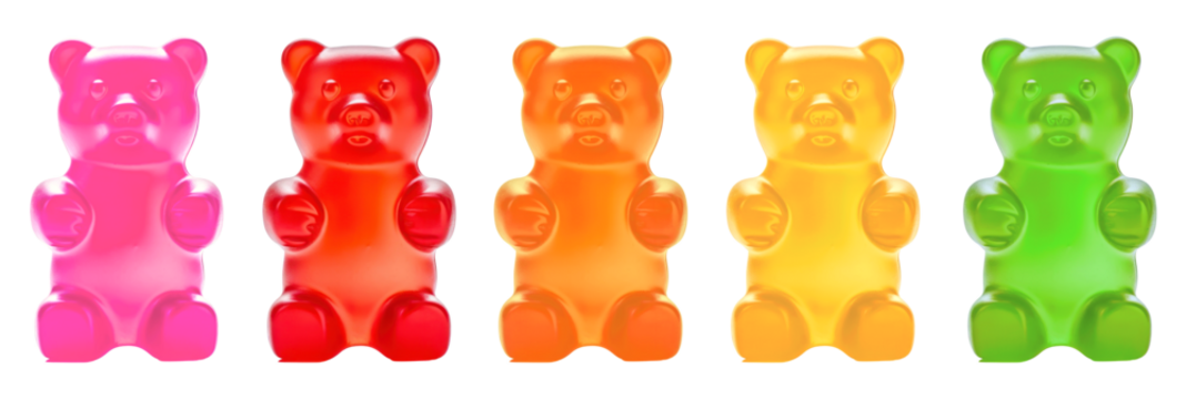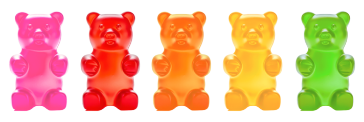 Five colorful gummy bears standing in a row on transparent background