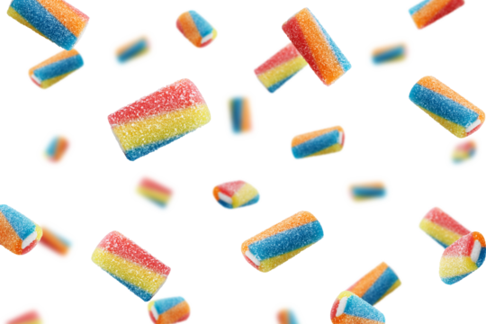 Falling Gummy candy, isolated on white background, selective focus