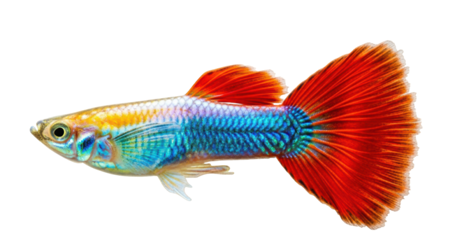 Vibrant male guppy fish with elaborate tail fins and colorful body isolated on transparent background