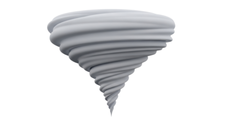A swirling, three-dimensional rendering of a gray tornado isolated against a white background.