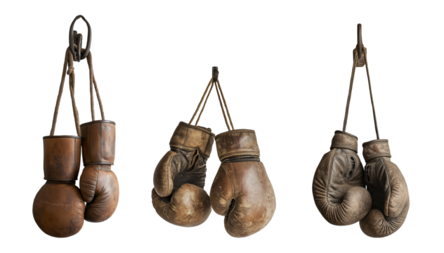 Vintage boxing gloves hanging in a rustic setting, showcasing the history and craftsmanship of the sport