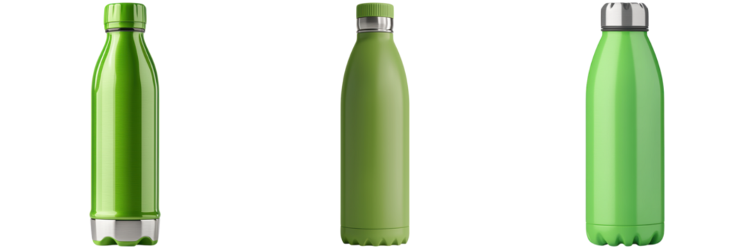 Red plastic reusable sports bottle for hydration and fitness, standing on a transparent background