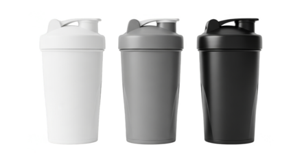 Collection of Three Sleek Shaker Bottles in Black, White, and Gray with Transparent Background
