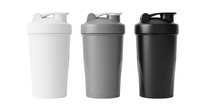 "Protein Shaker Bottles Set – White, Grey & Black – Isolated on Transparent Background PNG – High-Quality Fitness Bottle Mockup"