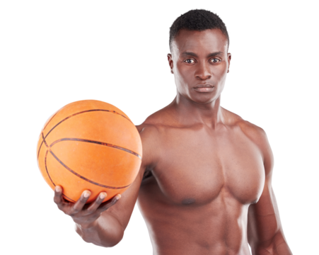 Basketball player, man and fitness portrait isolated on transparent, png background in exercise and health. Workout, offer and young athlete, model or african person in sports training or competition
