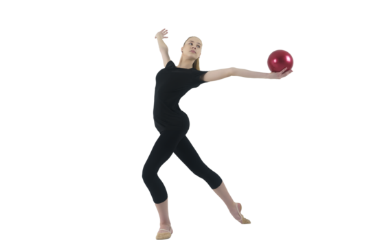 young gymnast in a photo studio shows the elements of exercises with a ball,