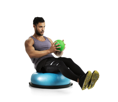 Fitness, man with medicine ball and training isolated against a transparent png background. Workout or exercise, practice with sportswear and male athlete with gym equipment pose for health wellness