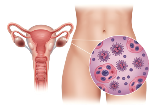 Female reproductive system anatomy with magnified view of bacterial infection.