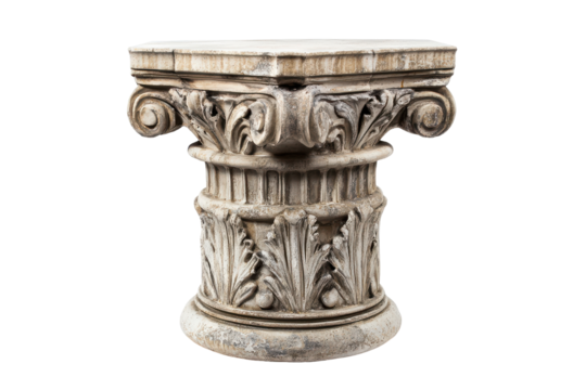 Antique stone pedestal with ornate carvings isolated on transparent background. Classic roman column pedestal with intricate detailing and a weathered patina finish isolated on white background.