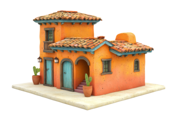 Mexican adobe house with vibrant colors and clay roof tiles, on a white backdrop