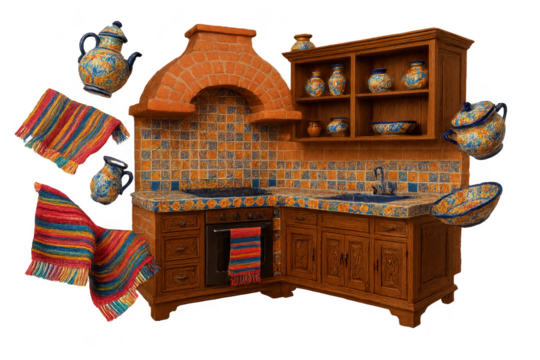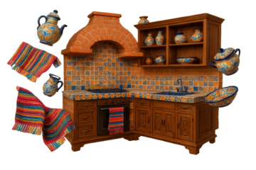 Mexican kitchen isolated on transparent, featuring pottery and textiles.