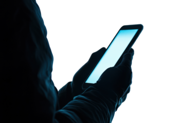 Digital Shadow: A mysterious figure shrouded in darkness, their face obscured, holds a glowing smartphone with a blank screen, suggesting a sense of secrecy, anonymity, and potential danger.