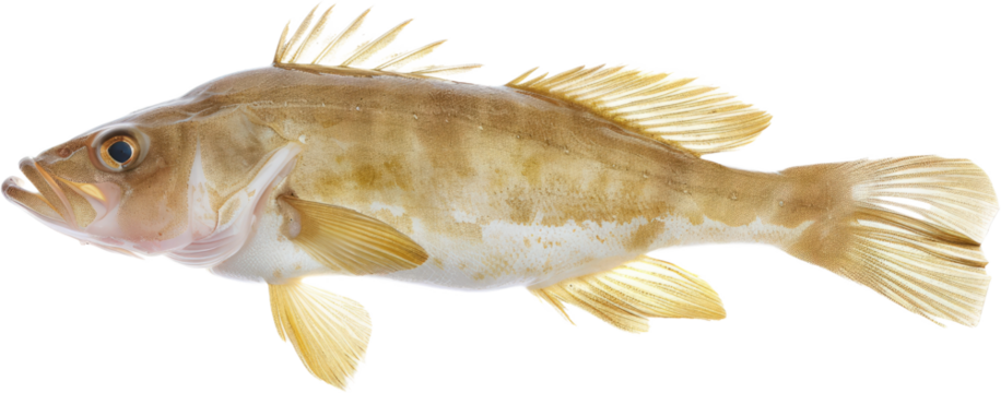 A whole barramundi fish with a highly textured, scaly surface isolated on white background. Suitable for marketing or business purposes. PNG file