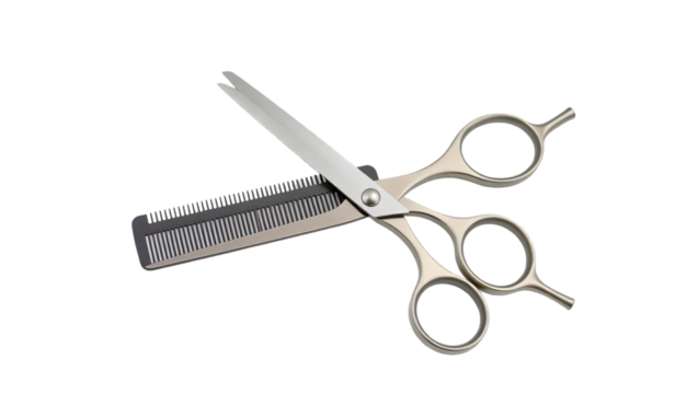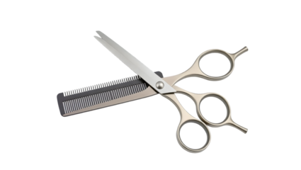 Professional silver scissors and black comb isolated on a transparent background for hairstyling