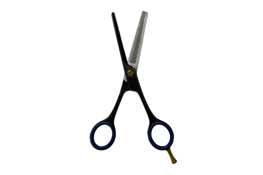 Professional hair scissors or thinning scissors isolated on a transparent background. Completely in focus. Focus stacking.