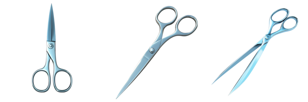 Three variations of stainless steel scissors isolated on a white background, perfect for medical, hairdressing, or general cutting uses.