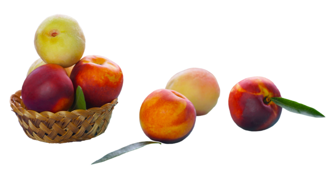 Smooth, hairless peaches in a basket on a white background