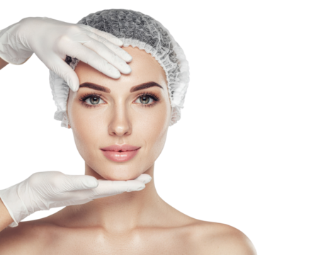 Close up of surgeon wearing surgical mask, hairnet and gloves, showing hands in protective blue medical latex gloves on transparent background