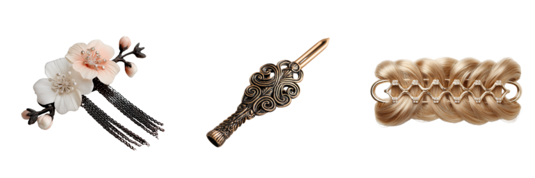Set of Close-up of trendy hairpin accessories for women, claw hair clips on transparent png background. Ai generated