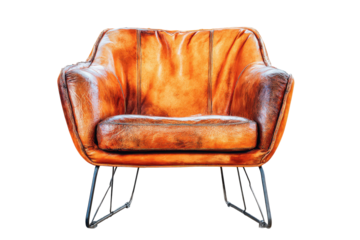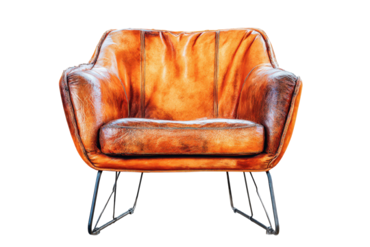 Vintage brown leather armchair with modern hairpin legs isolated on white background.