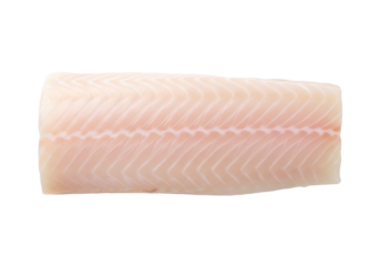 Tender Pacific cod loin, raw fish fillet featuring a light hue and flaky texture, perfect for pan-searing or steaming. isolated on white background. top view.