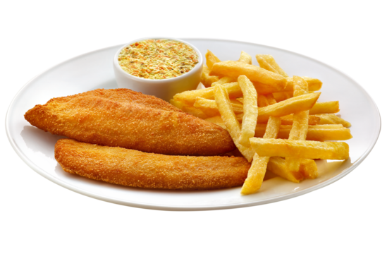 prato com filé de peixe empanado acompanhado de batatas fritas e maionese temperada isolado em fundo transparente - fish 'n' chips