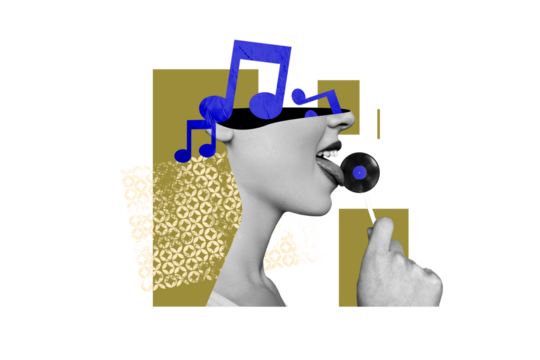 Composite photo collage of smile girl half head lick vinyl disk lollipop music vintage record candy stick isolated on painted background