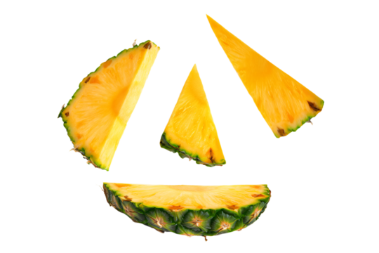 Pineapple slice isolated png. Pineapple on transparent background. Cut pineapple no background. Pineapple half of slice and piece on transparent png. Full depth of field.