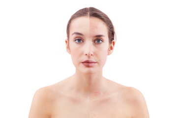 Portrait of a young woman showing a before and after face comparison of skin with and without makeup. Half and half face, left side is smooth, right side is with blemishes. Isolated background