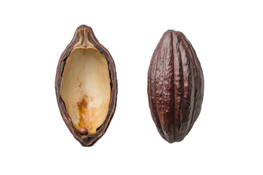Open cacao pod filled with raw beans isolated on transparent background. Whole and half cocoa pod with raw beans isolated on white background.