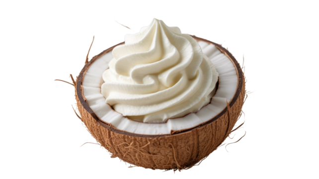 A half coconut shell filled with a beautiful swirl of creamy white coconut whipped cream, offering a delicious tropical dessert. background removed