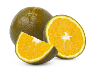 Two whole oranges and one half orange with green leaves isolated on transparent background