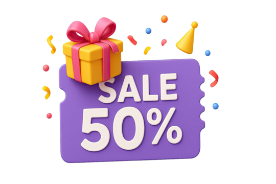 Colorful 3D illustration of special half price discount voucher with bright yellow gift box, ribbon bow and festive elements isolated on white background