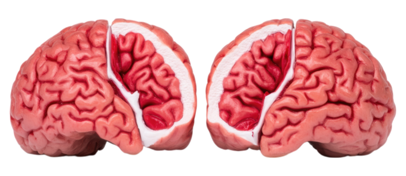 A detailed 3D illustration of a human brain split into two halves, showcasing the intricate folds and internal structure.