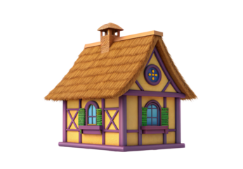 Colorful cartoon cottage with thatched roof and purple timber frame, isolated on a transparent background