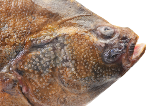 A whole barramundi fish with a highly textured, scaly surface isolated on white background. Suitable for marketing or business purposes. PNG file
