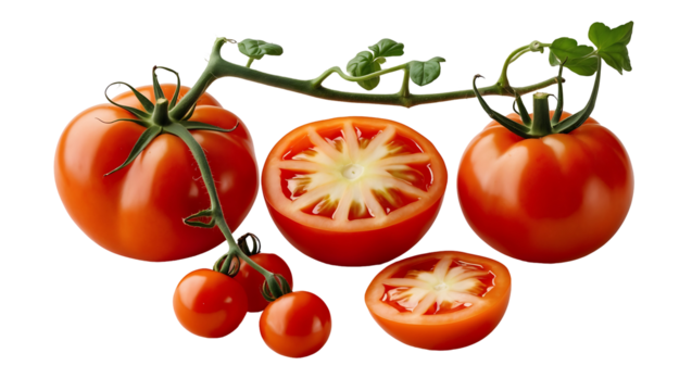 Variety of red tomatoes including whole, sliced, and halved pieces, fresh and organic tomato set on a clear background