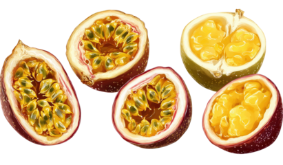 Artistic rendering of halved tropical passion fruits, revealing juicy pulp and seeds