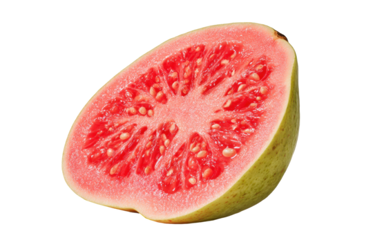 Half of a ripe pink guava fruit isolated on transparent background. Fresh ripe pink guava fruit halved revealing juicy pulp and seeds isolated on white background.