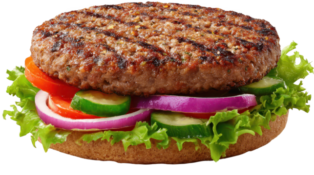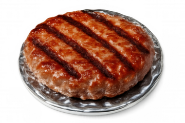 Juicy grilled burger patty displaying crisp char lines, resting on silver plate, transparent backdrop highlighting seared meat texture and appetizing appearance