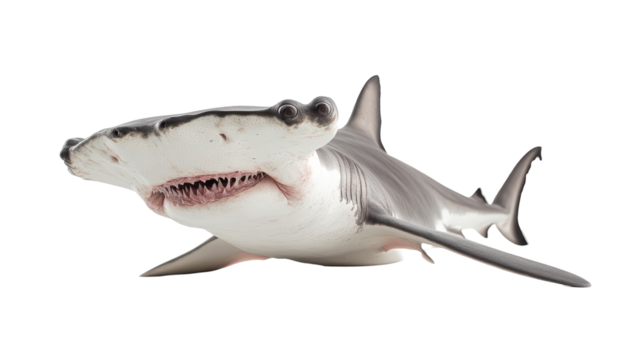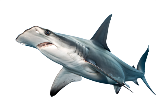 High-resolution image of a hammerhead shark against a white background, showcasing its unique head shape and streamlined body.