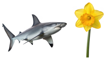 Hammerhead shark animal and Daffodils flower isolated on transparent background