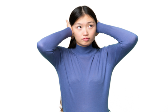 Young Asian woman over isolated chroma key background frustrated and covering ears