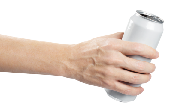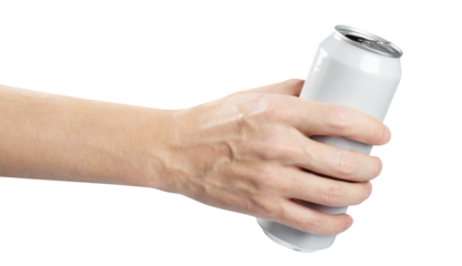 Two hands holding up beverage cans with can mockup and zero calories labels, isolated on white isolated on transparent background