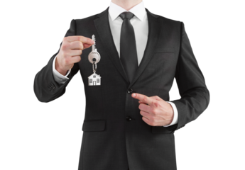 A man in a suit holding house keys on a white background, symbolizing property ownership or real estate concept