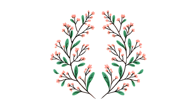 Floral branch with pink blossoms and green leaves forming a symmetrical design isolated on transparent background