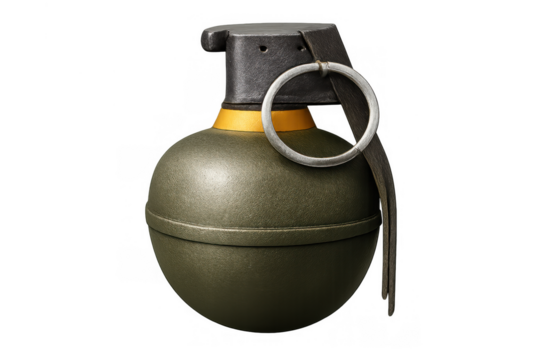 An isolated hand grenade on a transparent background representing military equipment and explosive ordnance for combat