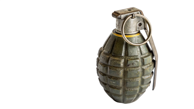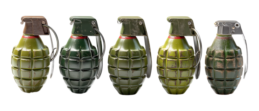 PNG of A metallic green hand grenade captured from a side angle, showcasing intricate details and textures.