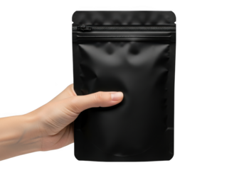 Woman's hand holding a brown paper shopping bag with handles. Isolated on transparent background, png